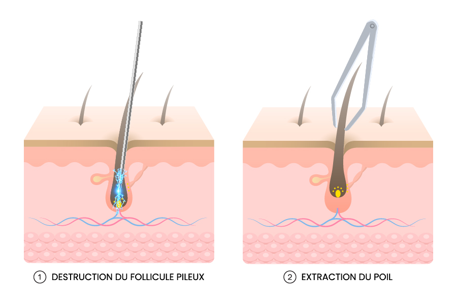 • Un courant haute fréquence est délivré pour détruire les structures responsables de le pousse du poil.